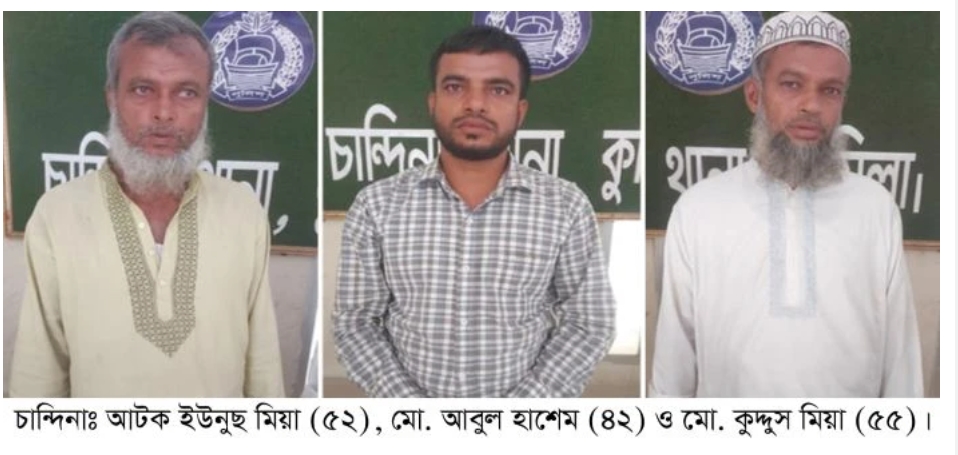 আটককৃতরা হলেন- কুমিল্লার চান্দিনা উপজেলার বরকইট গ্রামের মৃত আহম্মদ আলীর ছেলে মো. ইউনুছ মিয়া (৫২), মো. আবুল হাশেম (৪২) ও মো. কুদ্দুস মিয়া (৫৫)।