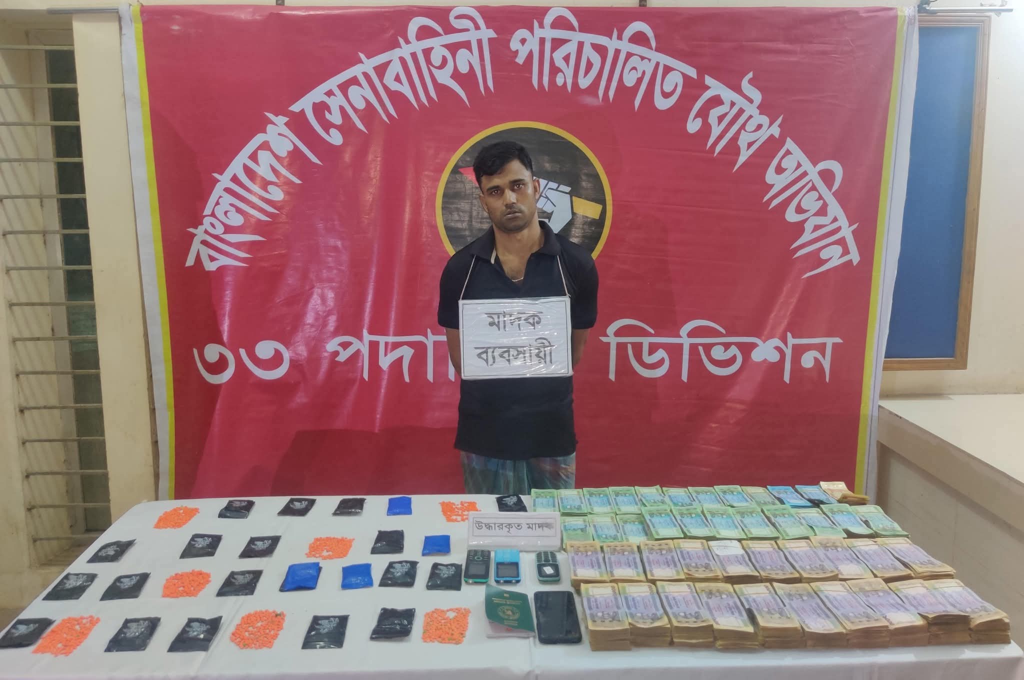 কুমিল্লার চান্দিনায় সেনা ও পুলিশের যৌথ অভিযানে উপজেলার শীর্ষ মাদক ব্যবসায়ী মো. মোস্তফা (৩০) কে আটক করা হয়েছে। এসময় তার কাছ থেকে মাদক বিক্রির ৫২ লক্ষ ৮৮ হাজার টাকা,৩ হাজার ৬৪০ পিচ ইয়াবা ট্যাবলেট,০১ টি পাসপোর্ট ও ০৪টি মোবাইল ফোন উদ্ধার করা হয়।