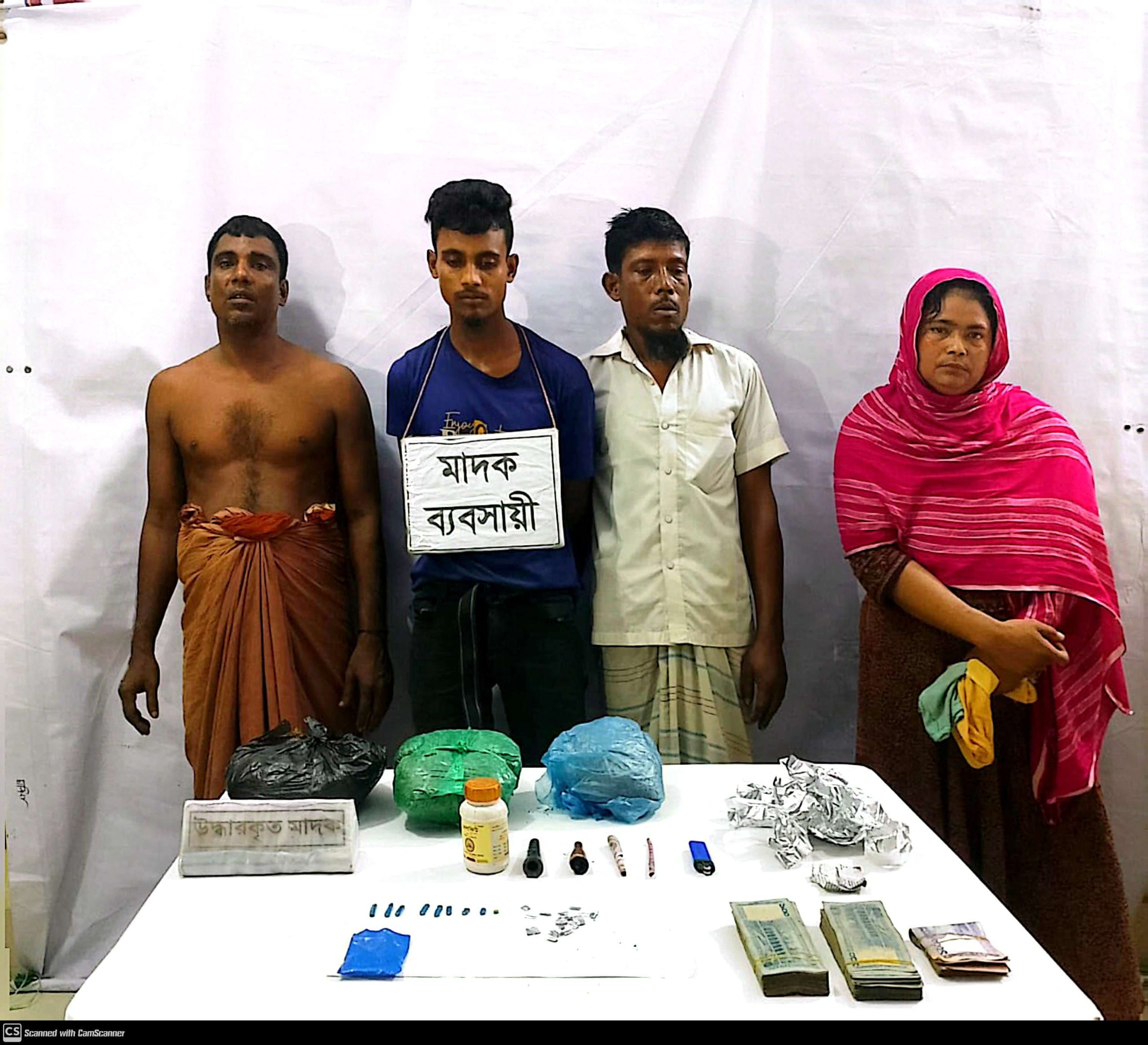 আটককৃতরা হলেন,স্থানীয়ভাবে কুখ্যাত ‘মাদক সম্রাজ্ঞী’ হিসেবে পরিচিত মোছাঃ রুমা, তার সহযোগী রিদয় মিয়া, মোঃ জাহাঙ্গীর এবং মোঃ শহিদুল ইসলাম। সেনাবাহিনীর দেওয়া তথ্যমতে, তাদের কাছ থেকে ২৯ পিস ইয়াবা, ১ কেজি গাঁজা, নগদ ২৫ হাজার ৩২০ টাকা এবং ইয়াবা ও গাঁজা সেবনের বিভিন্ন উপকরণ জব্দ করা হয়েছে।