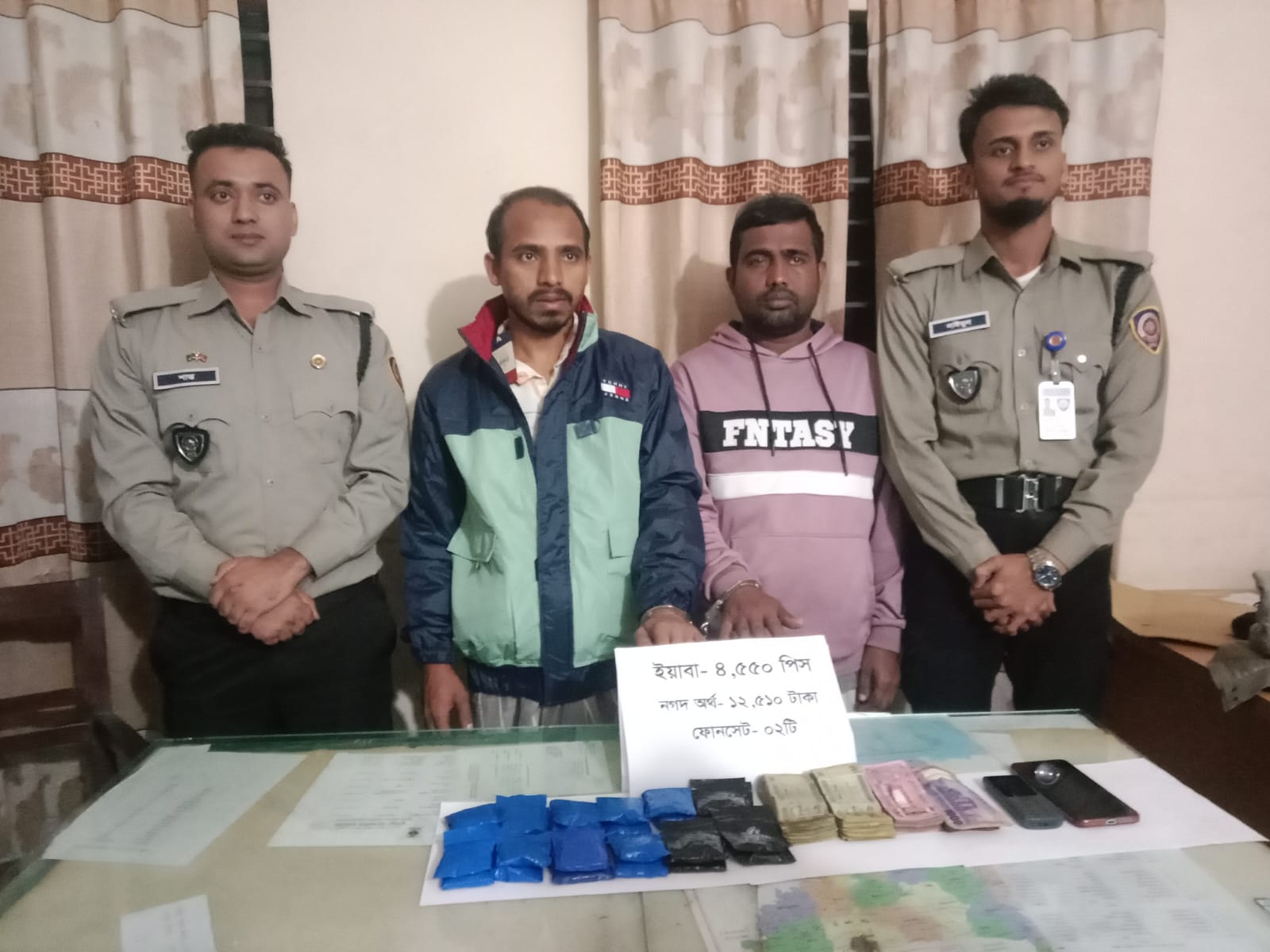 অভিযান সংশ্লিষ্ট সূত্র জানায়, একই শপিং ব্যাগের ভিতর রাখা ২২টি পলি জিপারের প্রতিটিতে ২০০ করে মোট ৪৪০০ পিস এবং একটিতে ১৫০ পিস ইয়াবা পাওয়া যায়। সর্বমোট উদ্ধার করা হয় ৪৫৫০ পিস ইয়াবা ট্যাবলেট। এছাড়া মাদক বিক্রির ১২,৫১০ টাকা, এবং মাদক ব্যবসায় তথ্য আদানবপ্রদানের কাজে ব্যবহৃত অ্যান্ড্রয়েড ফোন ১টি ও বাটন ফোন ১টি জব্দ করা হয়।